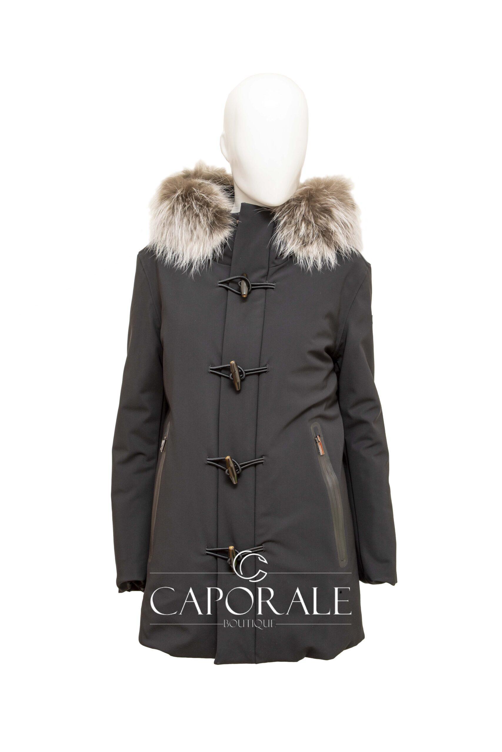 Materiale esterno: 79% poliammide e 21% elastico. Fodera: 100% poliammide. Imbottitura: 70% down e 30% feather. Chiusura centrale tramite zip doppio cursore e alamari. Due tasche esterne con chiusura tramite zip termo-saldate.