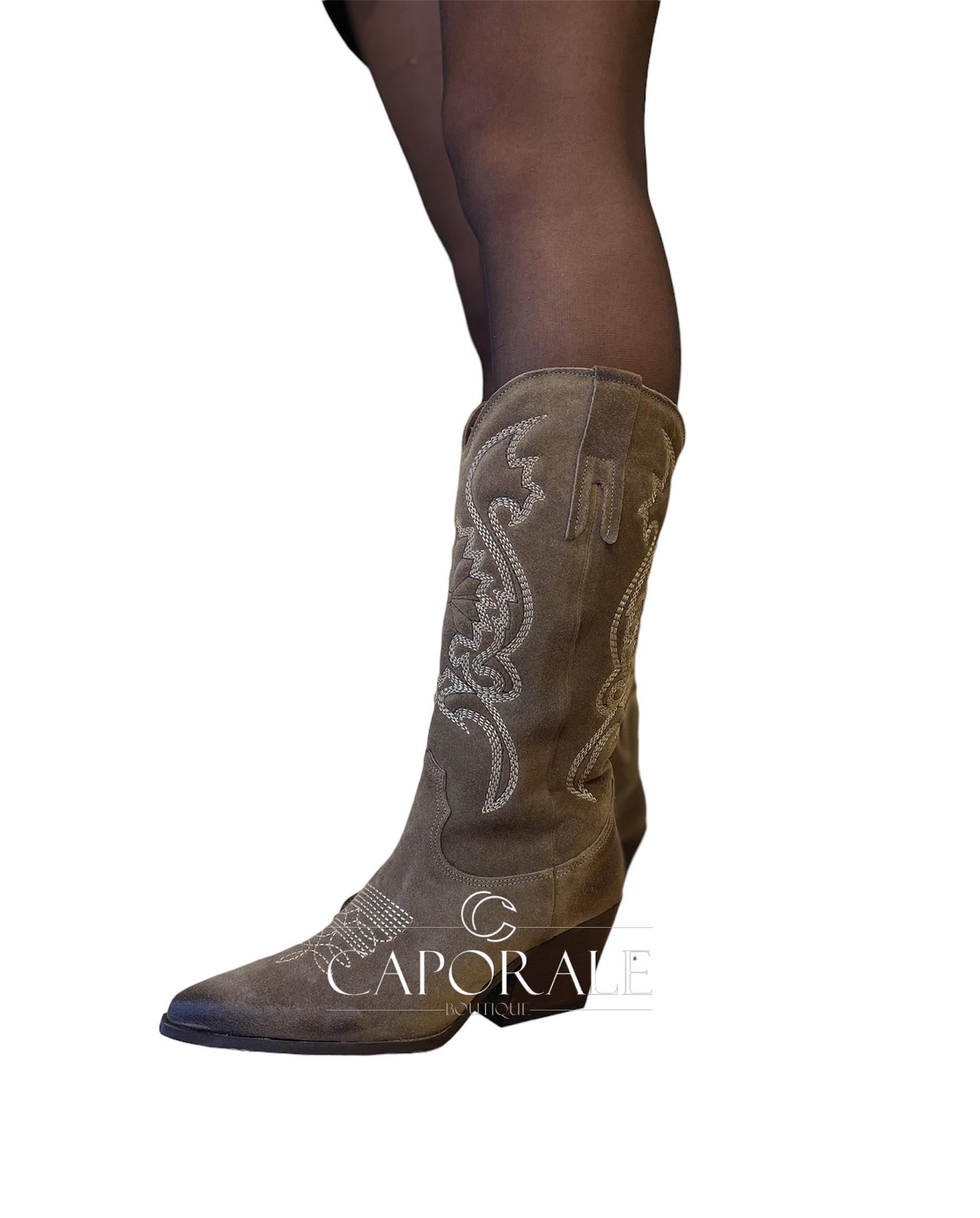 Lo stile country degli stivali Pernille Paris. Stivali in camoscio color testa di moro e vitello color nero con rinforzi. Puntale a lancia. Caratteristico disegno a fiamma cucito sul gambale. Suola in cuoio con tacco texano 3,5 cm.