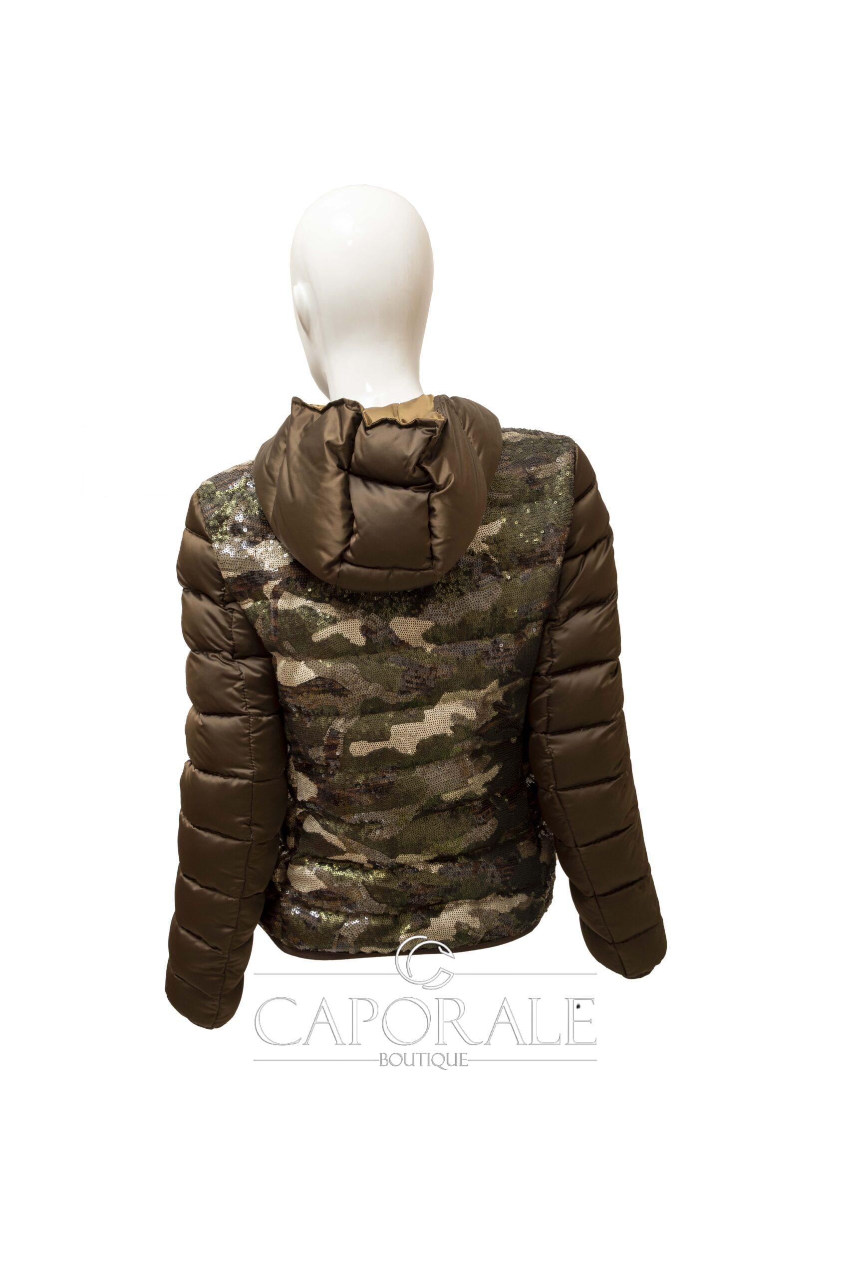 Tessuto: 100% poliestere. Imbottitura: 90% piumino d’anatra e 10% piuma d’anatra. Chiusura con cerniera + cappuccio. Logo stampato sul braccio. Presenti davanti e dietro paillettes.