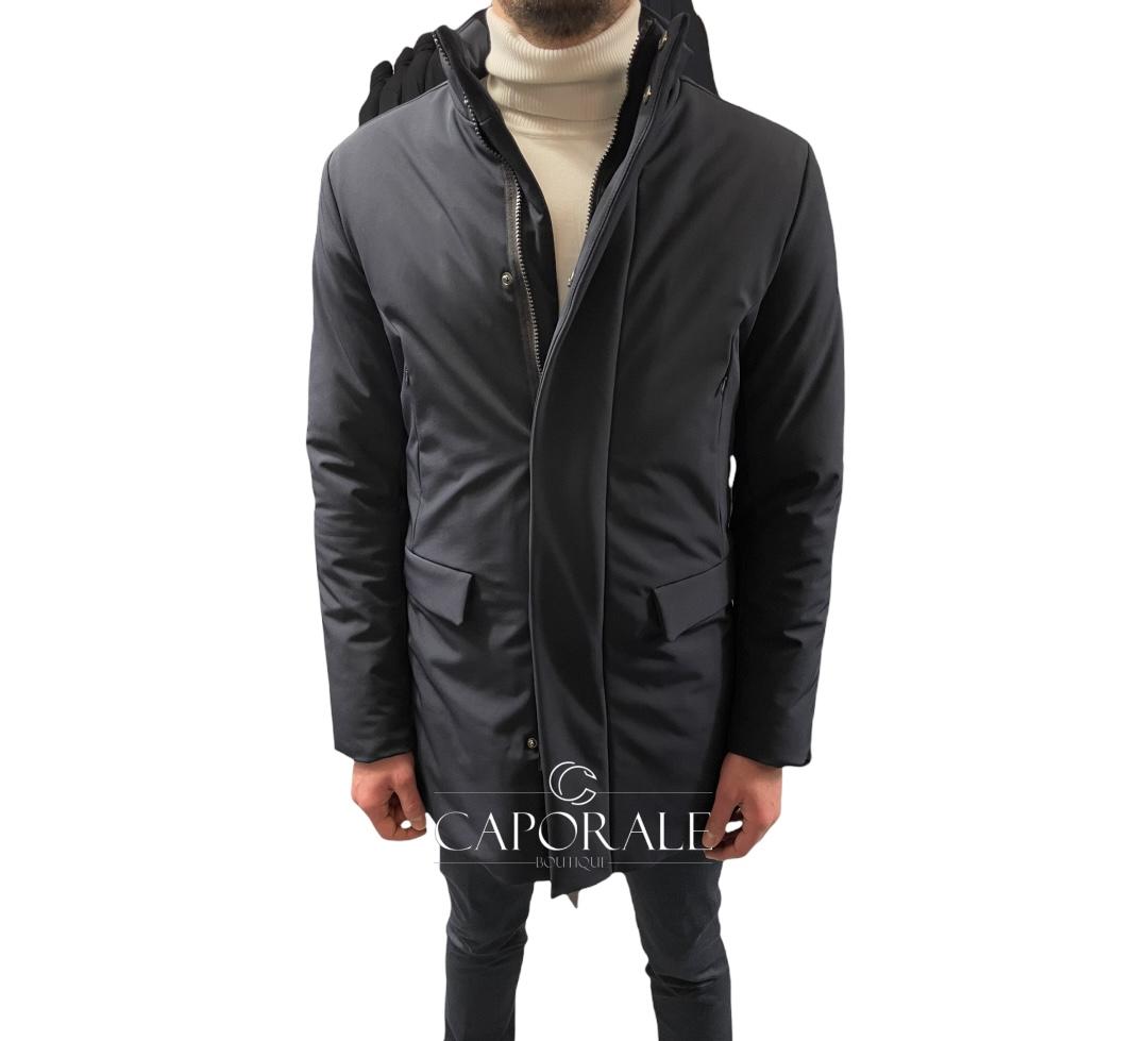 Cappotto Uomo Les Copains 192T02038 Blu/Nero/Grigio; chiusura zip e bottoni, logo sulla manica sinistra.