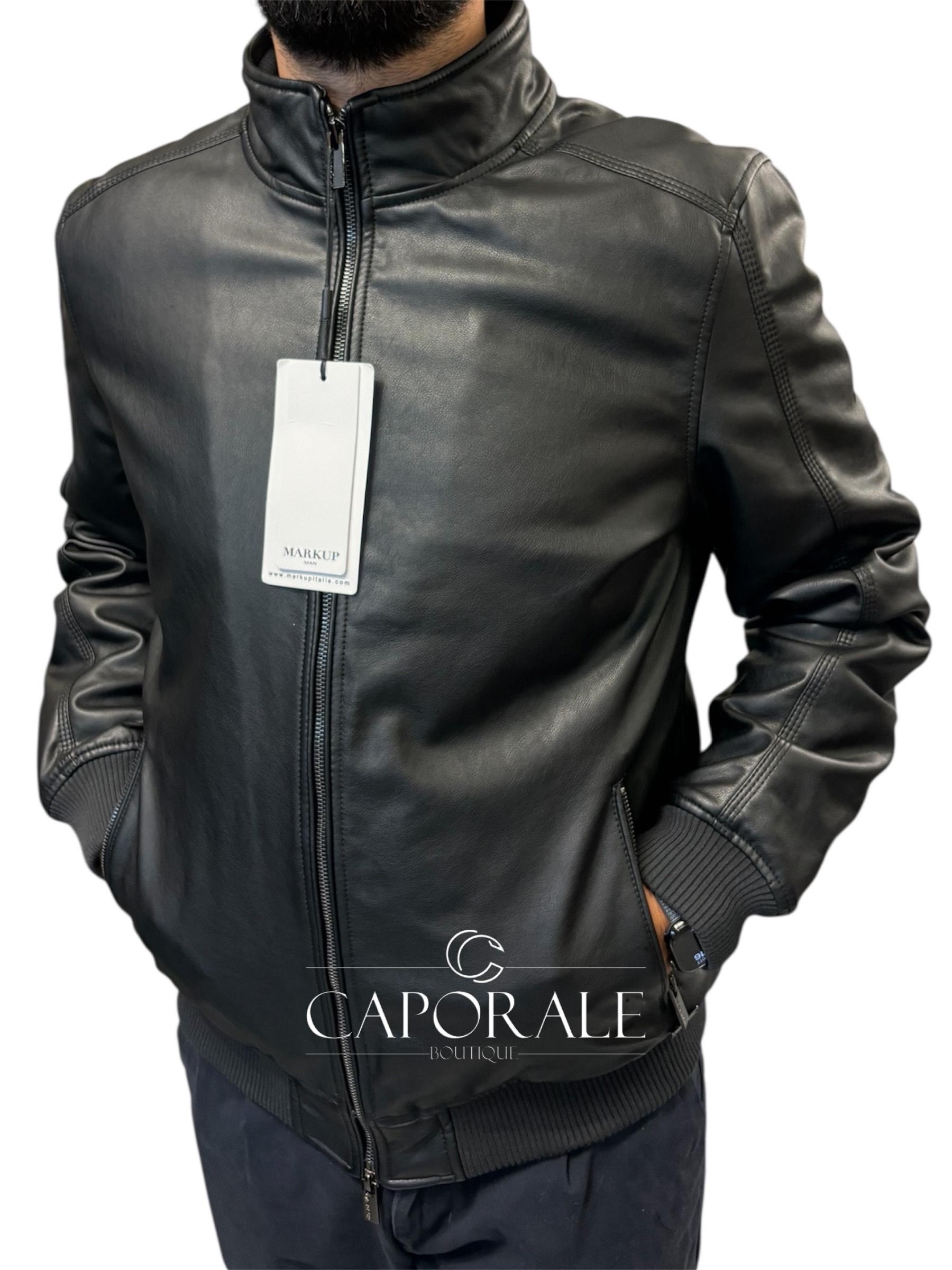 Il giubbino in pelle nera firmato Markup è un classico intramontabile reinterpretato in chiave moderna.