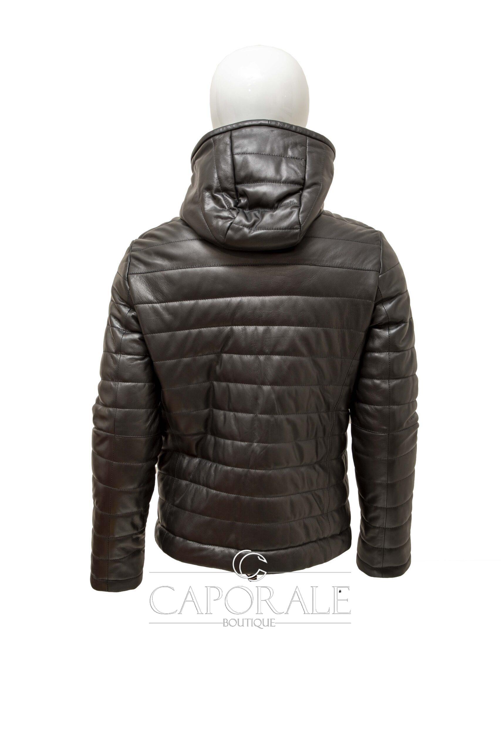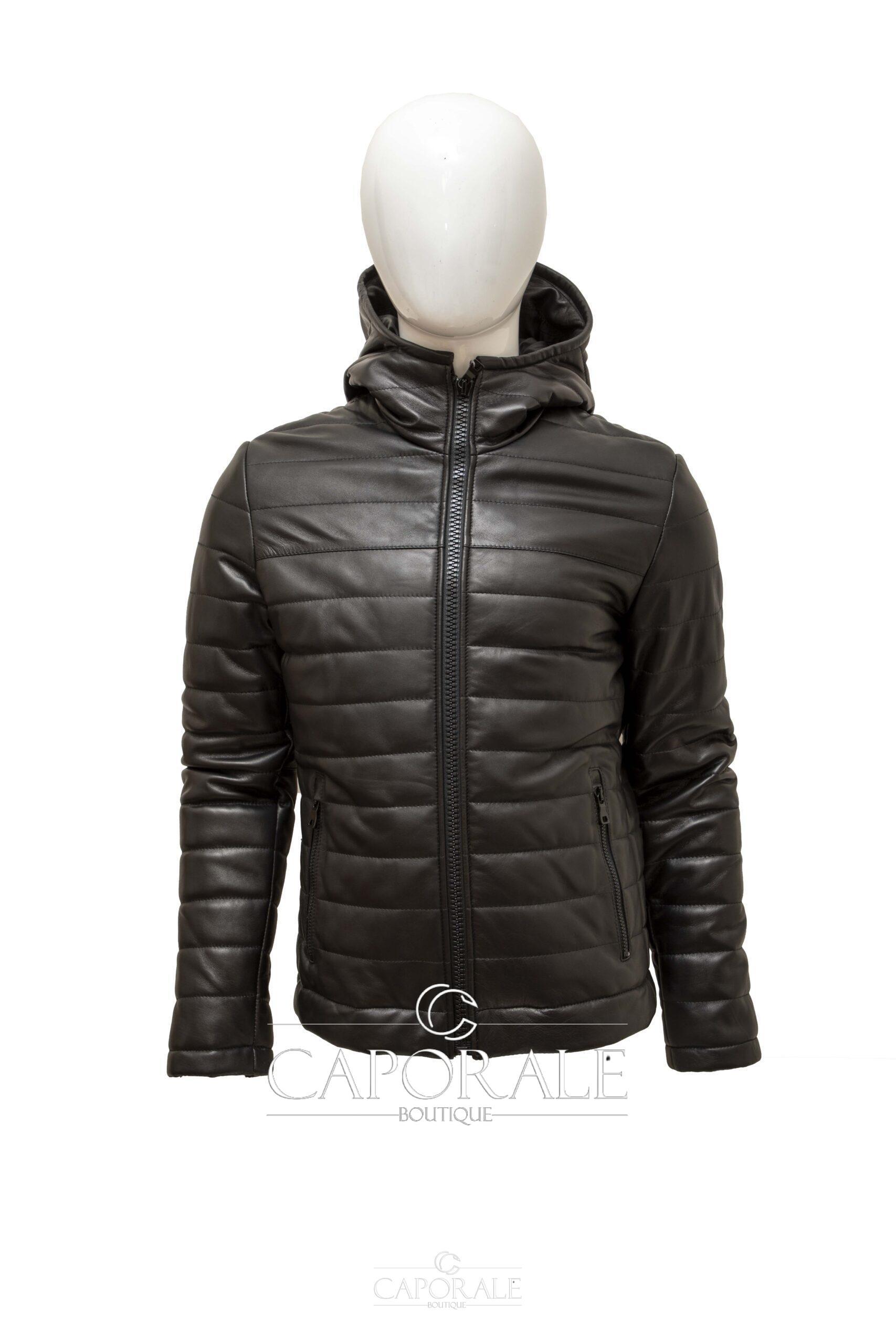Giubbino in vera pelle artigianale. Pellame nappa liscia. Chiusura cerniera + cappuccio.