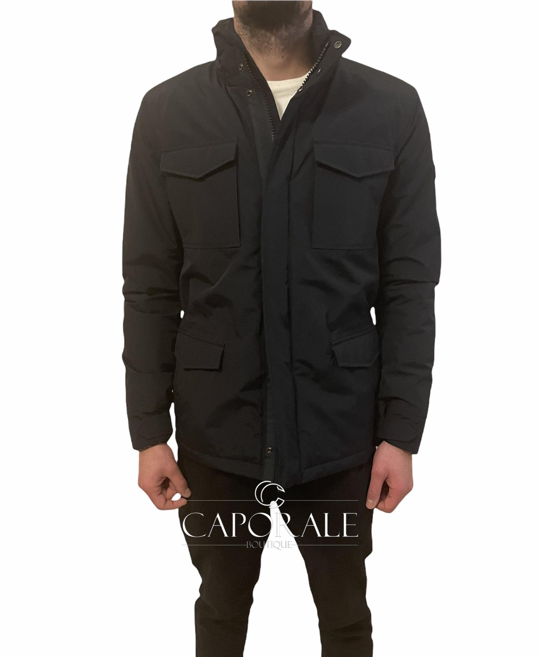 Materiale: 60% cotone e 40% poliammide. Fodera: 100% poliammide. Vestibilità slim. Chiusura con cerniera e bottoni a pressione.